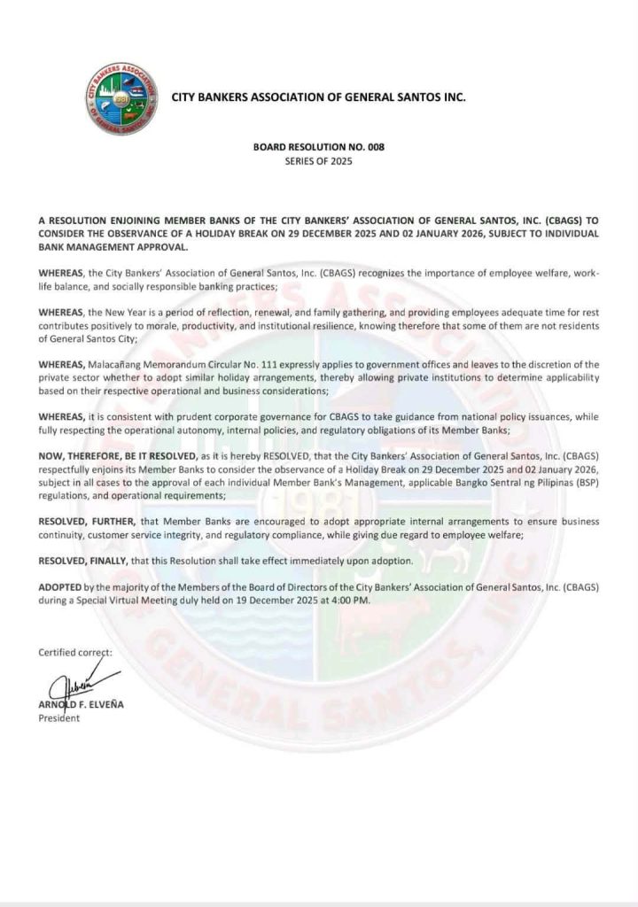 A Resolution Enjoining member banks of the City Bankers Association of General Santos City, Inc. (CBAGS) to consider the observance of a holiday break on 29 December 2025 and January 2026, Subject to individual Bank Management Approval.